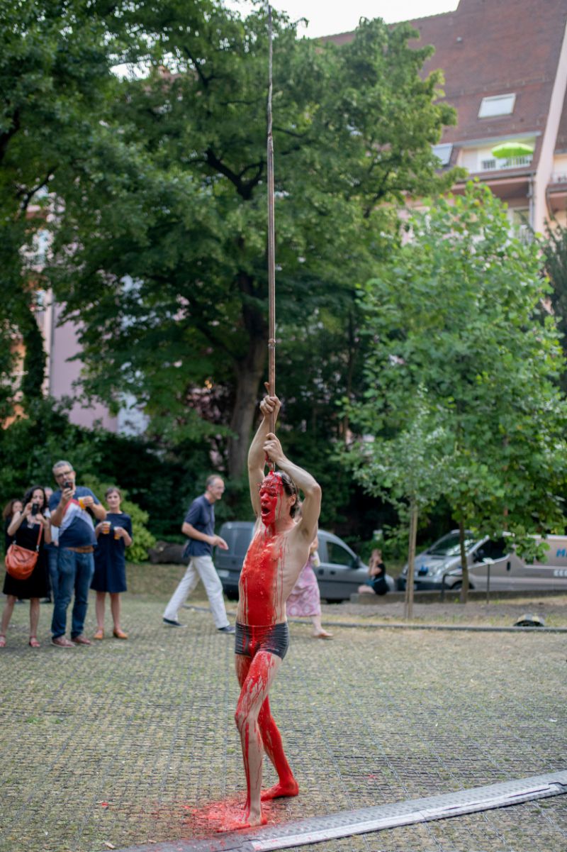 sabre forgé d'un tuyau de gaz en cuivre, gouache rouge, slip de bain.